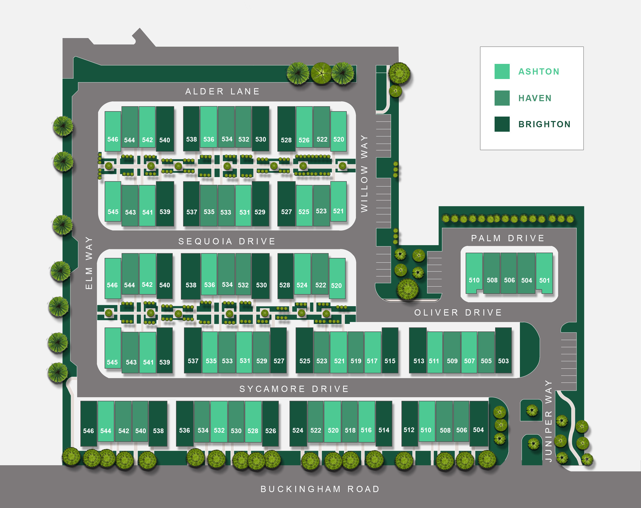 Explore the thoughtfully designed layout of Park Hollow, featuring a mix of our three modern townhome floor plans – the Ashton, Haven, and Brighton. The community is conveniently arranged along tree-lined streets including Alder Lane, Sequoia Drive, and Sycamore Drive, with easy access from Buckingham Road.